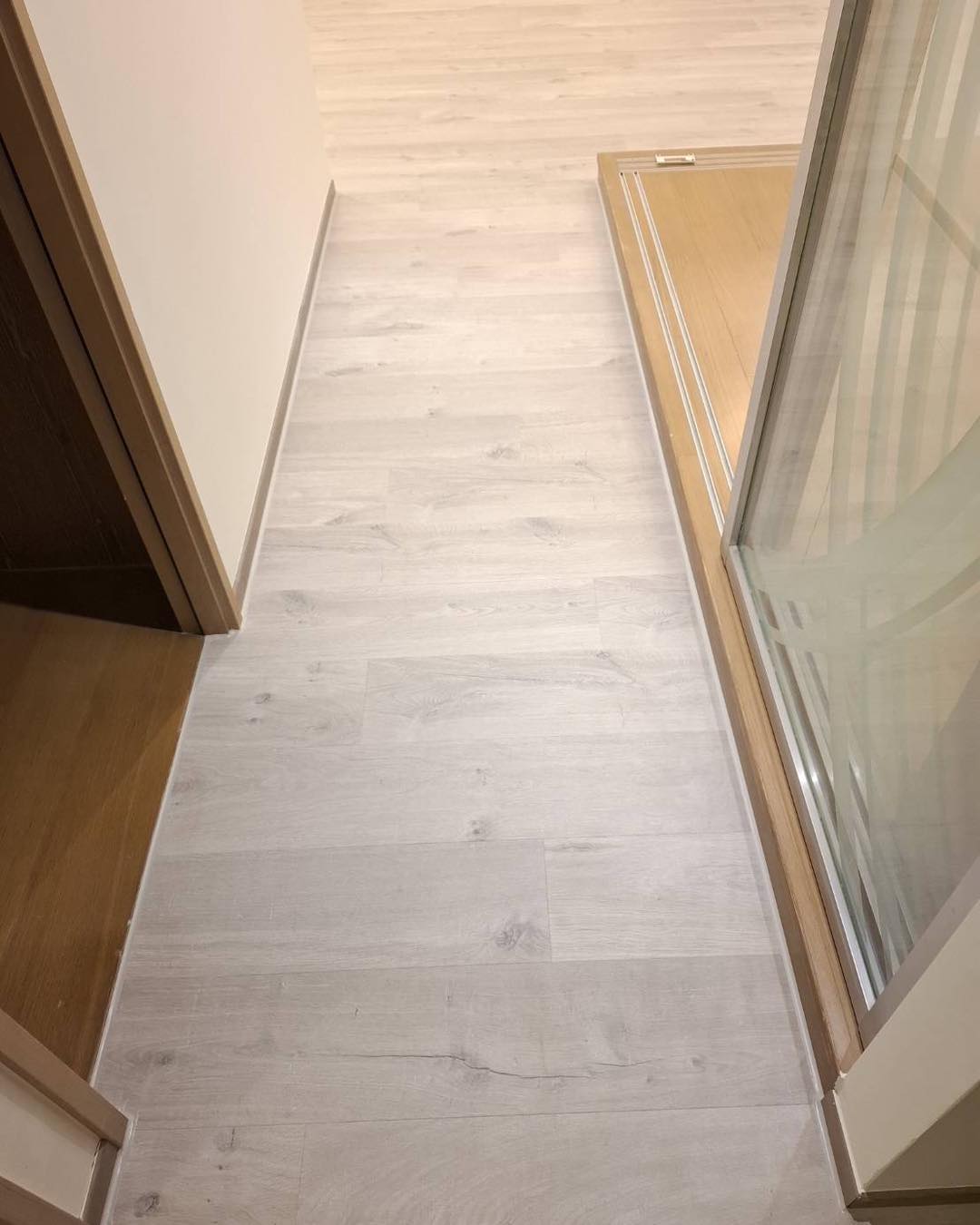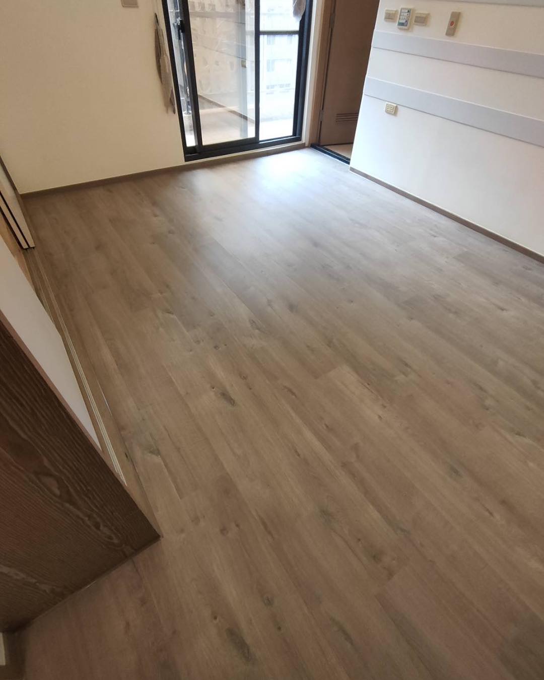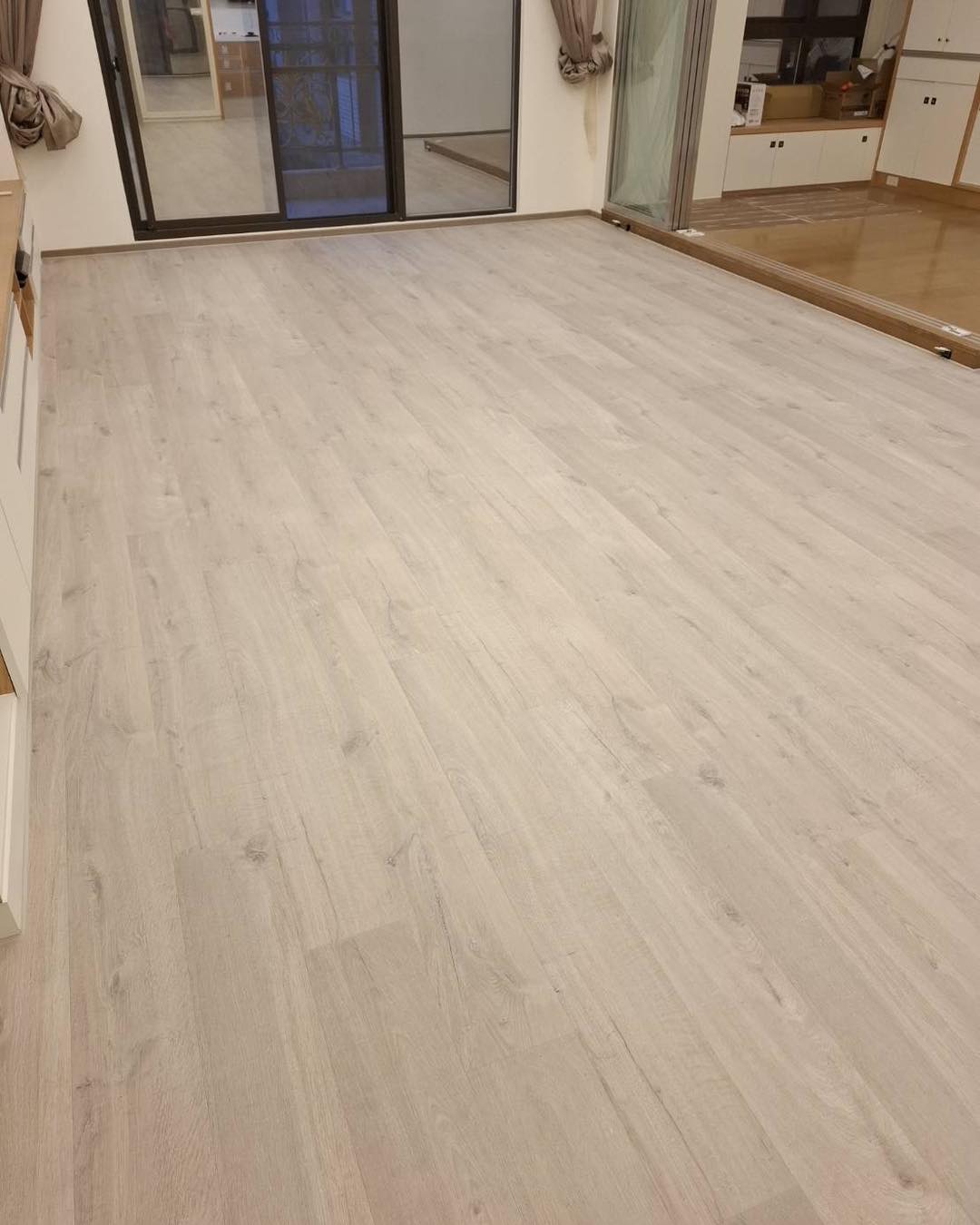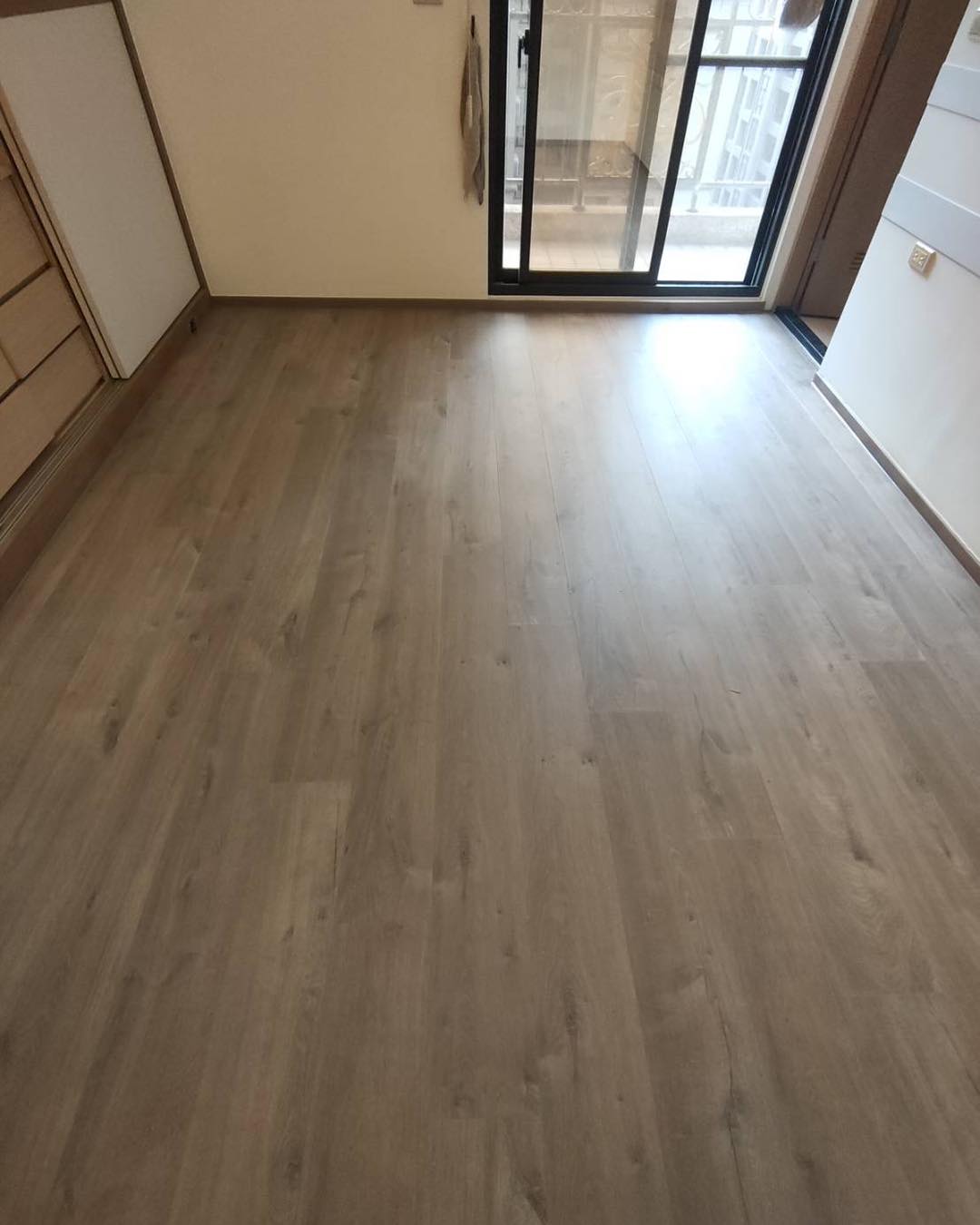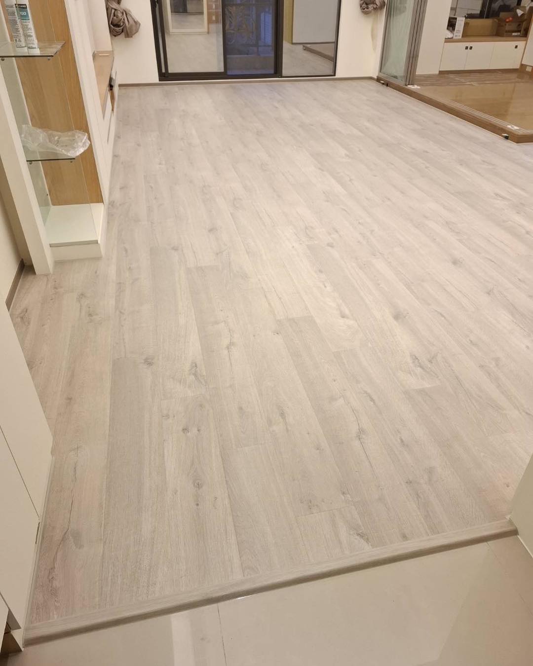 【進口超耐磨木地板】此案場原地況為拋光石英磚地面 選用僅能超耐磨木地板來鋪設 最後用矽利康收邊