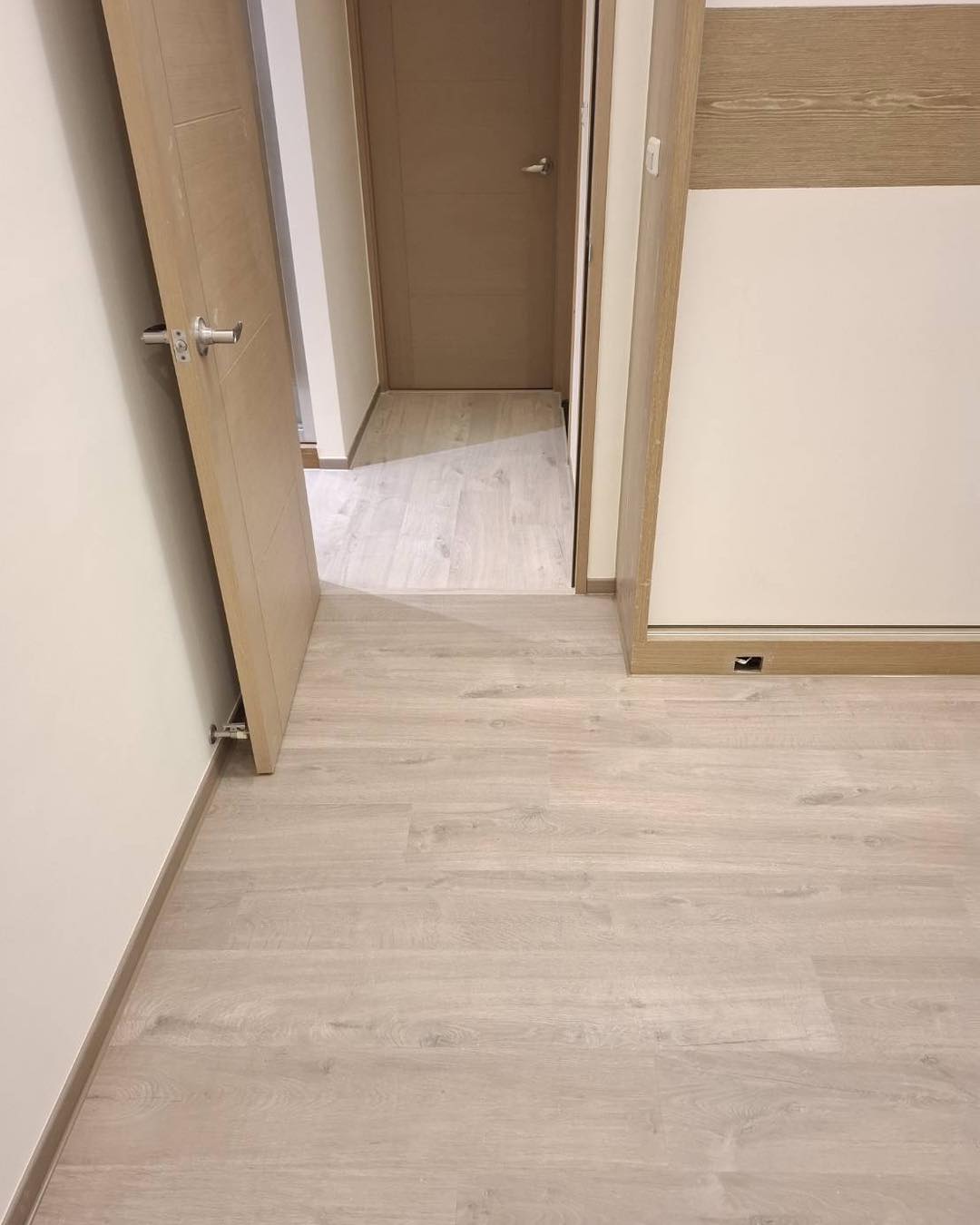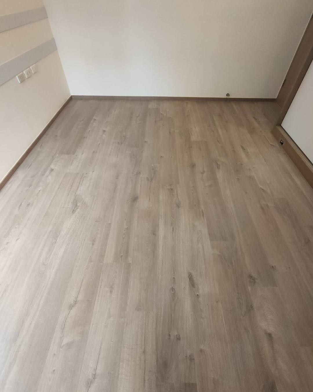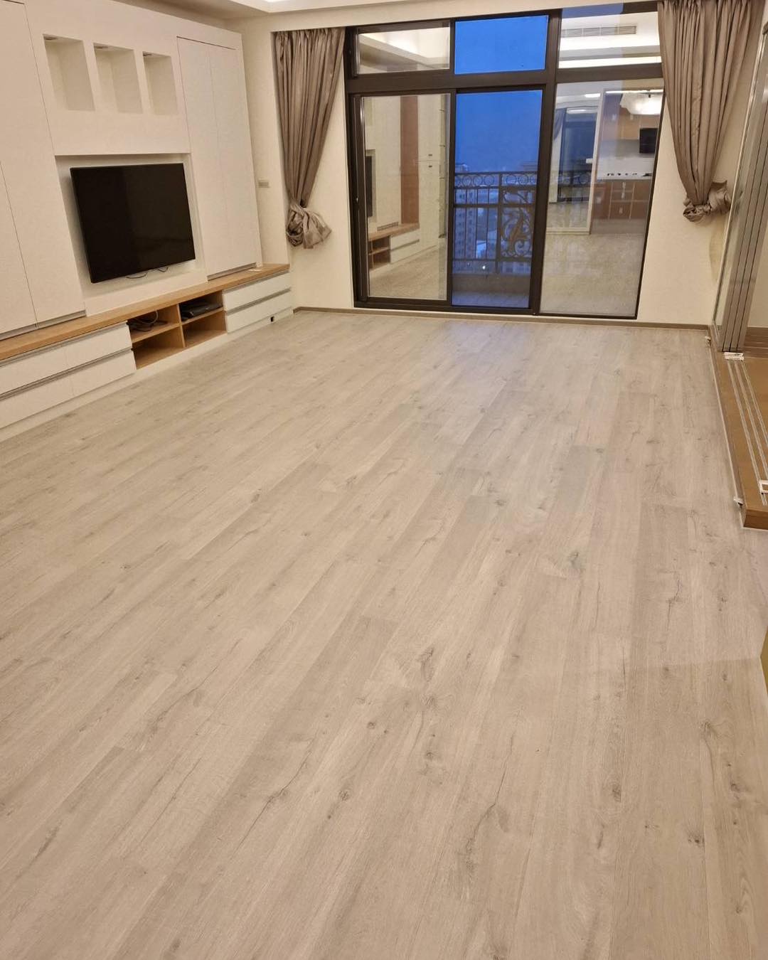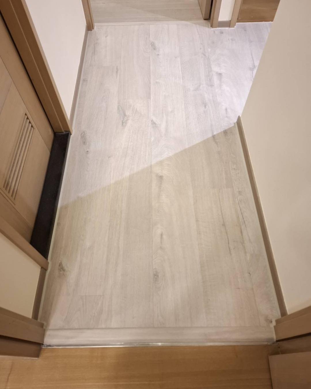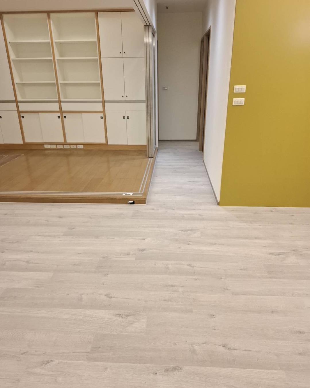 【進口超耐磨木地板】此案場原地況為拋光石英磚地面 選用僅能超耐磨木地板來鋪設 最後用矽利康收邊